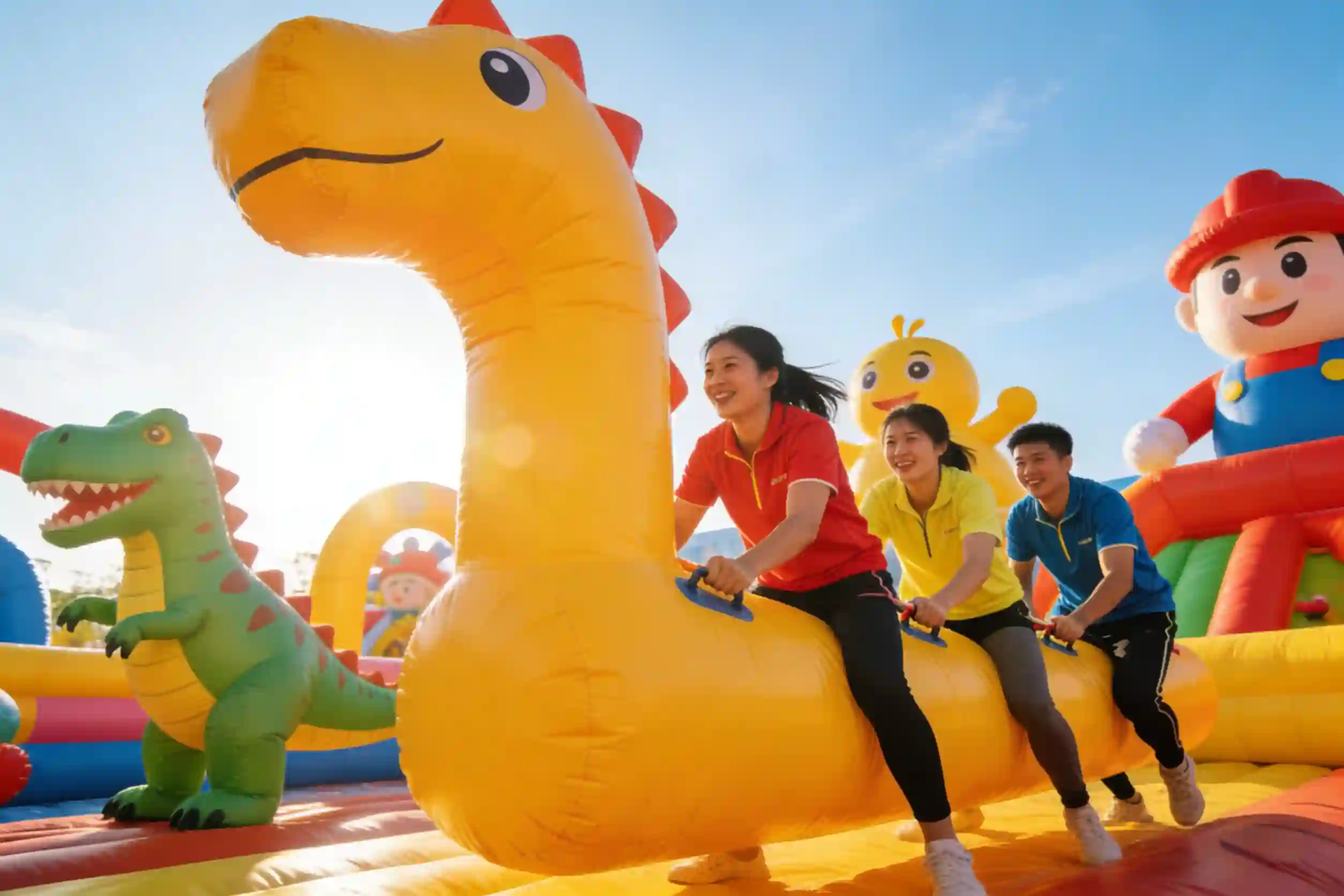 选用安全环保的充气毛毛虫道具,队员分组骑坐在毛毛虫道具上,双手紧握把手,在指定赛道内,通过全员同步发力、统一节奏,完成前进、转弯、冲刺等竞速任务,率先到达终点者获胜。项目兼具趣味性与协作性,既能快速活跃团建氛围,打破团队隔阂,又能锻炼团队的协同发力、节奏把控与执行力,适配企业团建、年会配套、新员工破冰等各类场景,参与门槛低、娱乐性强。
